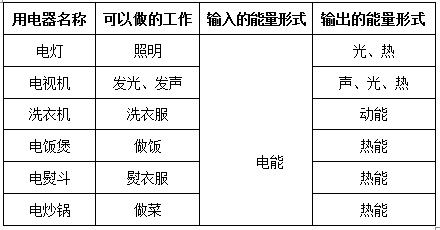 P61 我们家里有哪些用电器?可以做什么工作?工作时把电能变成了什么能量形式?调查后把它们记录在下面的表格里。