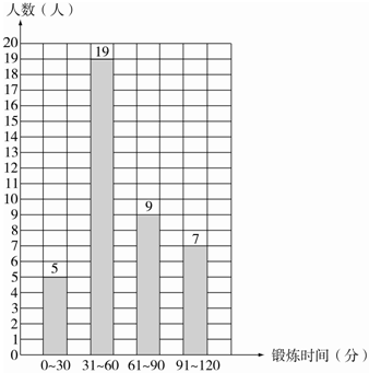 (1)通过观察统计表,可以看出锻炼时间在0~30分的人数是5人,锻炼时间在31~60分的人数是19人,锻炼时间在61~90分的人数是9人,锻炼时间在91~120分的人数是7人。锻炼时间在31~60分的人数最多,是19人;锻炼时间在0~30分的人数最少,是5人。它们相差19-5=14(人)。