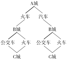 分析:用列举法写出所有可能出现的情况:李老师从A城到B城有两种乘车方式,到了B城之后还有两种乘车方式去C城,如图所示: