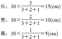分析:本题考查了学生利用按比例分配解决问题的能力。根据长方形的周长=(长+宽)×2,可计算出长方形长与宽的和为20÷2=10(cm),又因为长方形长与宽的比是3∶2,所以可把10 cm平均分成3+2=5(份),长占其中的3分,也就是10×
