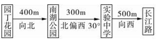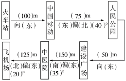 分析:本题考查了学生根据路线图描述行走路线的能力以及对线段比例尺的掌握情况。想正确描述行走路线,就要根据物体的移动,掌握好参照点的变化,进而准确描述出方向和距离。3路公共汽车从火车站出发,则以火车站为参照点,到下一站是中国移动,汽车向正东方向行驶,根据比例尺可知,图上1 cm的距离是实际上的50 m,由此可得出火车站距离中国移动100 m;3路公共汽车从中国移动继续行驶,下一站是人民公园,以中国移动为参照点,汽车向东偏北40°方向行驶,西站之间的图上距离是1.5 cm,所以实际距离是75 m;汽车再继续向正东方向行驶,下一站是建设广场,两站之间的图上距离1 cm,所以实际距离是50 m;汽车从建设广场再向中医院行驶,以建设广场为参照点,中医院在建设广场南偏东35°的方向上,西站之间的图上距离是3 cm,所以实际距离是150 m;最后汽车从中医院开往终点飞机场,以中医院为参照点,飞机场在中医院是北偏东20°方向上,西站之间的图上距离是2.5 cm,所以实际距离是125 m。