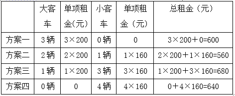 (1)根据大客车限乘40人,小客车限乘30人可知,有多种不同的租车方案(可单租一种车辆,也可两种车辆都租),如下表所示:
