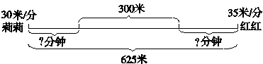由上图可知:莉莉走的路程+红红走的路程=全程-两楼的间距,若设x分钟后两人相距625米,则可得30x+35x=625-300,解方程即可。