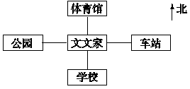 分析:根据描述确定场所在平面图中的位置时,先确定四个基本方向:上北、下南、左西、右东,再找出各场所相应的位置。体育馆在文文家的北面,根据“上北”将体育馆填在文文家上面的框里;文文家的西面是公园,根据“左西”将公园填在文文家左面的框里;东面是车站,根据“右东”将车站填在文文家右面的框里;学校在文文家的南面,根据“下南”将学校填在文文家下面的框里。