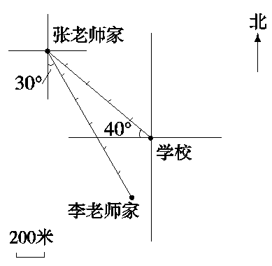 分析:首先以学校为观测点,建立方向标,在右上角指示“北”方向,在左下角标注单位长度,图上距离0.6cm表示实际距离200米。根据“张老师家在学校西偏北40°,距离是960米”可画出一条以学校为起点向西偏北40°方向长为7.2cm的线段。然后再以张老师家为观测点,用同样的方法确定李老师家的位置。