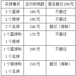 5.分析:买了两个球,可能买了2个篮球、2个排球或2个足球,如果买了2个篮球,应付80×2=160(元),如果买了2个排球,应付90×2=180(元),如果买了2个足球,应付120×2=240(元);也可能买了1个篮球和1个排球、1个篮球和1个足球或1个排球和1个足球,如果买了1个篮球和1个排球,应付80+90=170(元),如果买了1个篮球和1个足球,应付80+120=200(元),如果买了1个排球和1个足球,应付90+120=210(元)。因为同学们带了200元,所以不能买2个足球,也不能买1个排球和1个足球。所以,同学们带200元买两个球,应付的钱数有4种情况。