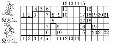 分析:可以把每个小格看成边长为1厘米的正方形,通过数小格的方式可知,兔大宝走了21厘米,兔小宝走了22厘米,所以兔大宝走的路线短。如下图: