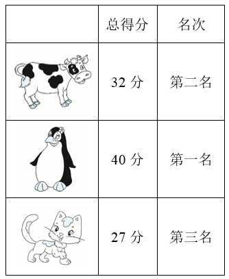 因为40>32>27,所以企鹅队是第一名,奶牛队是第二名,小猫队是第三名。