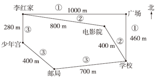 具体路线可描述为:李红从家出发,先向东南方向走800米到电影院,再向东南方向走400米到学校。……(3分)