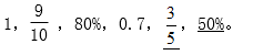 分析:在本题中给出的这四个数,除了第一个数“1”之外,有用分数表示的,有用百分数表示的80%,还有用小数表示的0.7。把这几个数都用小数表示为:1,0.9,0.8,0.7,发现每一个数都比它前面的数小0.1,这就是这串数字的规律,由此可以推算出,后面的数应该是0.6,0.5……但是按照此题的要求并不能填0.6和0.5,应该把0.6化成分数,0.5化成百分数,然后再填到题中的横线上。