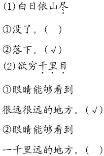 解析 理解诗句中词语的意思不能脱离语言环境,可先了解整首诗的大概意思,或根据诗句联想有关的画面,再根据自己的理解来解释词语,如“白日依山尽”是写太阳落山了,从这个语境中来理解“尽”,则应该是“落下”的意思。运用这样的方法解释词语就不难了。