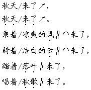 解析 这首诗语言生动流畅,读起来朗朗上口。朗读时,要注意语调的起伏和语速的快慢,要富有节奏感,饱含激情,充分体现出对秋天的喜爱之情,以及人们在秋天到来时的激动、喜悦的心情。如,读第1小节“秋天来了,秋天来了”时,要带着欣喜激动的语调,突出秋天到来时人们的愉悦心情。读后面语句的语速应该略慢些,在每个“来了”前停顿略长,要读出语气的变化。