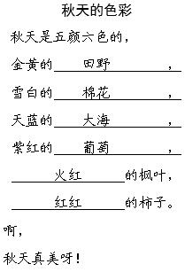 解析 这是一项综合训练,同学们可以展开丰富的想象,联系生活实际回答本题。秋天,大地一片金黄,所以第一空的答案不是唯一的,可以是“田野、稻田、麦穗”等。秋天,枫叶和柿子都会变成红色,最后两个空只要词语不重复,表示相应的颜色即可。
