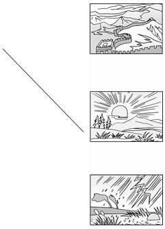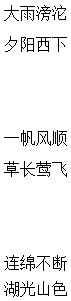答案 左上图:一帆风顺 左中图:草长莺飞 左下图:湖光山色 右上图:连绵不断 右下图:大雨滂沱