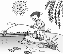 解析 首先按一定顺序细致地观察这幅图。这幅图向我们展示的是夏天小河边的景色:空中,烈日高悬;岸边,草木葱郁,垂柳依依,柳枝上停着一只鸣蝉;水中,鱼儿在自由自在地游动。一个小男孩站在岸边,满头大汗,手持钓竿正在钓鱼。突然,一条小鱼上钩了,小男孩用力一提,鱼儿跃出了水面,小男孩顿时眉开眼笑……