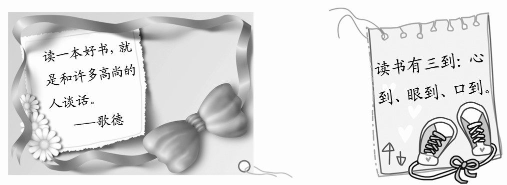 解析 先搜集有关“读书益处”的名言、诗句、格言等背一背,并用图画纸或硬一点的卡片剪成或绘制成自己喜欢的图案,然后制作成有创意的不同形式的书签。通过交流展示,互相说一说书签的作用,体会读书是一种十分重要的学习方式,增强对读书的兴趣。
