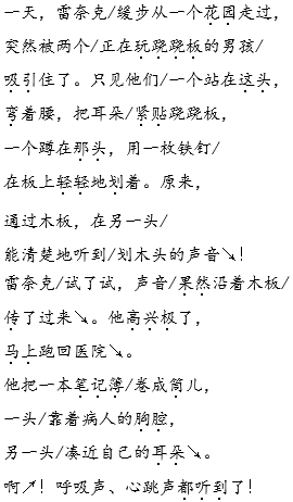 解析 这篇记叙文是一篇科学故事,语言平实、浅显、流畅。朗读基调是平和、舒缓的。读第1自然段时,语气深沉,语调低缓;读第2自然段时,语气惊奇,语调上扬,当雷奈克有惊奇的发现时,语气是欣喜若狂的;读第3自然段时,语气兴奋,语调轻快上扬;读第4自然段时,语气是欣喜的,体现出雷奈克爱观察、肯动脑的精神。