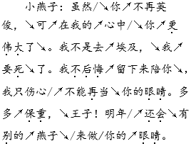 王子:很高兴你终于要去埃及了。小燕子,我也不再英俊了,忘掉我吧![王子听到小燕子的决定高兴极了,语调激昂,后面的话又带着凄婉的感情。]