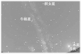 观察星空,或查阅有关星空的图片,找出天河、牵牛星和织女星。