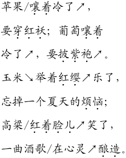解析 本文描写了秋天迷人的景色和丰收的景象,抒发了作者对秋天的热爱和赞美之情。本文语言优美生动,很有童趣。朗读的基调是抒情欢畅的,语气是亲切欣喜的,语调是欢快上扬的,要读出对秋天的赞美之情,也要读出对秋天的留恋之情。朗读时,注意抓住重点词语,如,“嚷着”“穿红袄”“披紫袍”“举着”“红着脸儿”等,要将这些词语读得生动鲜活,表现出对秋天的热爱之情。