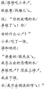 解析 这篇寓言故事的作者在双方对立、反复较量中刻画形象,揭示性格。把狼的凶残、蛮横和小羊的善良、温和刻画得入木三分,给读者留下了不可磨灭的印象。在分角色朗读时,要抓住描写狼和小羊的词句,并结合课文想象狼和小羊的不同神态、语气。狼第一次说的话,要读出盛气凌人、横加指责的语气;狼第二次说的话,要读出蛮横无理、怒气冲冲的语气;狼第三次说的话,要读出穷凶极恶的语气。小羊第一次说的话,要读出据理申辩和小心翼翼的语气;小羊第二次说的话,要读出竭力申辩和着急、害怕的语气。