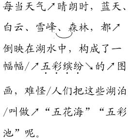 解析 本文笔触生动,语句清新,辞藻华美。朗读基调是深情酣畅的,语气亲切流畅,语调轻松上扬。朗读时,注意抓住文中的关键词语,如“插入云霄”“银光闪闪”“颗颗宝石”“镶嵌”“清澈见底”“色彩斑斓”“白练腾空”“银花四溅”“攀吊”“窥视”“憨态可掬”等,读得情绪饱满,读出九寨沟的景色的神奇、迷离、变化无穷,体现出九寨沟童话世界般的意境来。