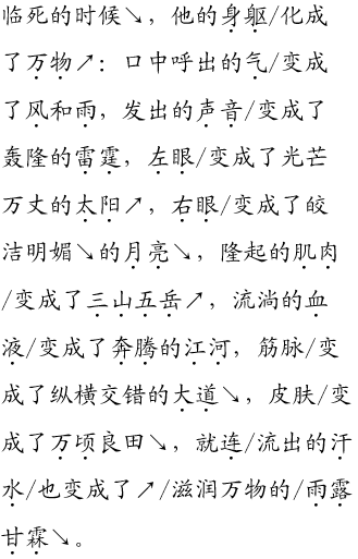 解析 本文的第六、七、八自然段写的是盘古用自己的身躯化生出了世间万物。这部分内容文字优美,描写细腻。特别是在背诵第七自然段时,要在熟读课文的基础上理清课文的描写顺序,可以先看一看盘古身躯的不同部分“气、声音、眼睛、肌肉、血液、筋脉、皮肤、汗水”分别变成了什么,抓住这条主线,背诵起来就容易多了。