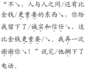 解析 本文语言虽朴实,但人物的言行却感人至深,尤其是第二部分(对话部分)情真意切,生动感人,充分体现出人间真情。朗读基调是亲切温和的,语气是诚恳亲切的,语调是轻松惬意、舒缓深情的。小红车主人的信任和“我”的诚实,要通过有感情的朗读来体会,把握人物的内心世界,体现出人间真情。
