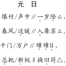 解析 本文选编的是两首古诗,《元日》是七言绝句,《江雪》是五言绝句。在朗读时要注意古诗的节奏美、音韵美,注意语调的起伏变化,处理好重音和韵脚的润色。朗读《元日》时,语气喜庆欢快,语调昂扬向上;朗读《江雪》时,语气凄婉幽叹,语调深沉低缓,表现作者不与当权者同流合污的清高、孤傲的品格。