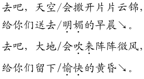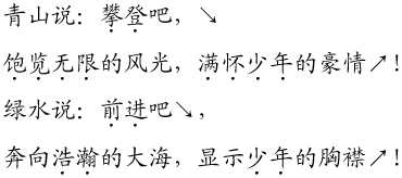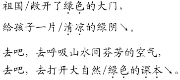 解析 这是一首清新、明快的诗歌,语言流畅而饱含激情。朗读的基调是激昂的。每一小节语速的快慢、语调的升降等不必强求一致,要有变化,要入情入境,读出情绪的变化,读出内心美好的感受。第一小节,语气清新欢畅,读出祖国的召唤;第二至第五小节,语气亲切、酣畅,语调奔放、激昂,情感真切、陶醉;第六小节和第一小节照应,但不是简单的重复,要注意变化,语气更加欢畅,第六小节的语调要比第一小节高昂,声舒气长,召唤得更加充满激情,更加恳切。