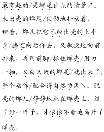 解析 本文极其生动地介绍了“金蝉脱壳”的过程,展示了那奇特动人的情景。朗读时,语气欣喜、好奇,语调生动而富有变化,总体是生动上扬的。朗读第四、五自然段感受脱壳中、脱壳后的奇特动人的情景时,语气要兴奋而充满惊奇;抓住重点词语,如“抽搐”“裂开”“抖动”等,进行有感情朗读。