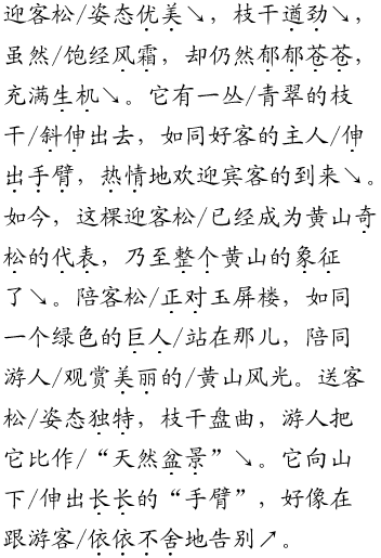 解析 本文语言优美,生动鲜活,让人们感受到黄山松的奇美,激发我们对祖国大好河山的热爱之情。朗读的基调是赞叹和喜爱。朗读第一自然段时,语气欣喜舒展。朗读第二自然段时,真切感受三大名松的神奇韵味,如“观松处”是大家公认的,因此读“当然”,语气是非常肯定的;迎客松的“饱经风霜”,要用凝重一点的语气来读;两个“如同”和一个“好像”,要读得惟妙惟肖,感情饱满。朗读第三自然段时,“千姿百态”“更加神奇”“更加秀美”等词句要用赞叹的语气。