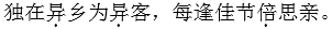 这两句诗的意思是:我孤独一人在外地,人生地疏,举目无亲,感到寂寞,每当遇到节日我就加倍地思念家中的亲人。
