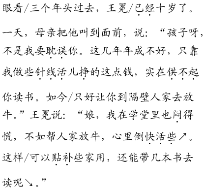解析 这是一篇人物故事,语言洗练、生动、形象、细腻。朗读时,要入情入境,注意语气、语调的变化。第一自然段,语气是深沉平静的,语调是陈述平直的;第二自然段,要读出母亲的通情达理和孩子懂得事理的语气,读出母亲的无奈和王冕体谅的语气,母亲的话语调低沉一些,王冕的话语调稍显轻松一些;第三自然段,秦家人交待的话,语气是同情、关心、爱护的,读母亲的语言时,语调低缓;第四自然段,描写王冕品行的语言要读得深情赞扬;第五、六自然段,语气要活泼一些,语调轻松上扬一些;第七自然段,要读出欣喜的语气,语调上扬饱满。