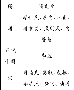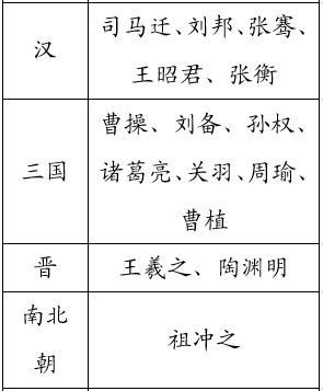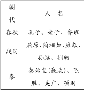 ●从语文课本和课外读物中,我们已经认识了许多古代名人。如能按朝代把他们的名字填写在下面的表格里,你对朝代的顺序一定能记得更清楚。看谁知道得多,填写得对。