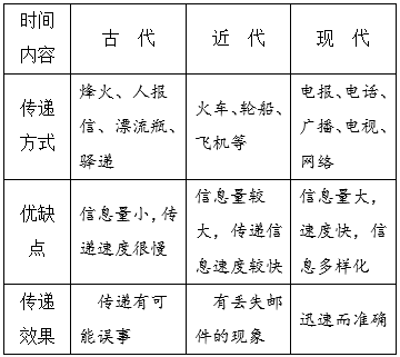 (1)填表:古今信息传递方式的比较。