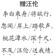 解析 朗读古诗,要在反复朗读中逐步体会诗中表达的感情。读《九月九日忆山东兄弟》时,语调要较为低沉,语速缓慢,突出“独、异、倍”等字,“少一人”要读得更低、更慢,表现诗人在他乡孤独寂寞、思念亲人的心境。读《赠汪伦》时,第一句要平缓,用叙述的语气;第二句语调稍扬,体现出惊喜之感;第三句语气要加重;第四句要稳而重,表现朋友间的深情厚谊。