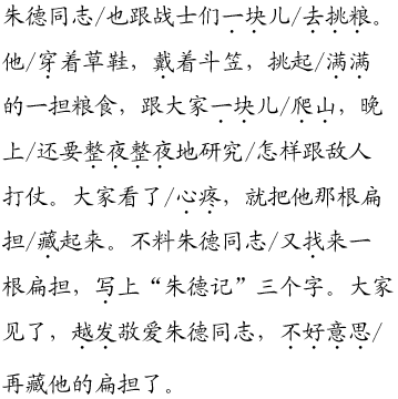 解析 朗读时,要透过文字想象描绘的情景、画面,体会挑粮的艰辛,朱德同志工作的劳累,战士们对他的关心和他坚持和大家一起挑粮的决心,然后怀着对朱德同志的崇敬之情来朗读课文。第1自然段可以用叙述的语气来读;读第2自然段时,语速适当放慢,突出“五六十里”“山高路陡,非常难走”“每次”“争着”等词句,体现红军战士不怕困难、不怕吃苦的精神;第3自然段,前两句要读得慢一些,表现出朱德同志的辛苦,后面的几句可以用正常的语速、欢快的语调来读,表现战士们对朱德的爱护和朱德以身作则的精神。