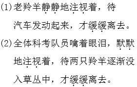 答案 这两个句子的句式完全一样,个别带点词语也相同,但表达的意思及感情却不一样。第一个句子中“静静”“注视”“缓缓”表现了老羚羊既希望小羚羊的伤快点好,又不忍别离的复杂心情。第二个句子中“默默”“注视”“缓缓”则表现了科考队员已经深深地被藏羚羊间的亲情感动。