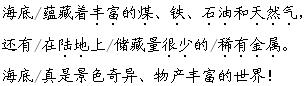 答案 宁静的海底世界中有无穷无尽的生物。动物会发出各种声音,活动方式也各不相同。植物色彩繁多,大小不一。海底有山,有峡谷,也有森林和草地,还蕴藏着丰富的煤、铁、石油、天然气和稀有金属。从这些地方都可以看出海底是“景色奇异、物产丰富”的世界。