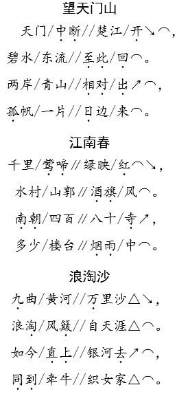 解析 读古诗,速度要慢些,边读边想,体会古诗的节奏美和音乐美,把握好停顿和语调的升降。同时还要在理解的基础上,真正感悟诗句所表达的思想感情。第一首诗写天门山的壮美景色,读的时候,要有惊叹的感觉。第二首诗写江南的无边春色,朗读时,要用轻柔的语调、欢喜的语气,读出对景色的赞美之情。
