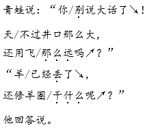 解析 本题主要是让同学们通过朗读的形式,感受寓言的寓意。读《坐井观天》时,重点在后两次对话。第二次对话:青蛙的话要用不相信的语气读;小鸟的话要用劝告、说服的语气读。第三次对话:青蛙讥笑小鸟,要用傲慢的语气读;小鸟的话要读出耐心地摆事实、讲道理的语气,表现出实事求是的诚恳态度。读《亡羊补牢》时,也要把对话朗读到位。如读丢羊人回答邻居的话时,要用不屑一顾的语气;读他第二次丢羊后的心理活动,要有后悔的感觉。