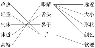 解析:观察时各种感觉器官各有分工,眼睛能看见物体的大小、形状、颜色、远近,耳朵能听清声音的大小、高低,鼻子能闻出物体的气味,舌头能尝出物体的味道(不明物体不能用尝的方法),手能分辨出物体的冷热、轻重、粗细。