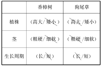 解析:本题考查草本植物和木本植物的特点。植株高大、茎粗硬、生命周期长的植物称为木本植物。植物矮小、茎细软、生命周期短的植物称为草本植物。