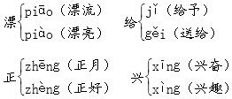 解析 这是多音字组词练习,目的是巩固本单元及本册书中出现的多音字,据词定音。我们先来按要求给多音字组词,然后同学之间相互订正答案。在正确组词的基础上,还可以与同学合作进行反向的练习,即一人写出含有这几个多音字的词语,另一人确定多音字的字音。