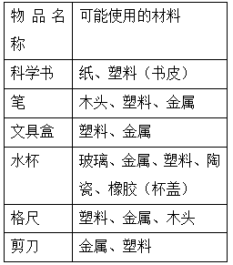 (1)木头 塑料 纤维 解析:本题考查的是常见的材料的种类。(2)黄白色 不太重 能削得动 能浮在水上 解析:一般的木材颜色是黄白色的,能用刀削动,但是相比金属材料来说要轻得多。(3)金属 塑料 解析:本题考查对身边常见物品的材料的认知程度。一般情况下,扣子是由金属、塑料做成的。