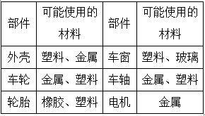 (1)A 解析:玻璃是透明的,适合用来作车窗。(2)B 解析:本题考查的是辨认塑料和金属。A中的凳子是由塑料制成的;C中的菜刀是由木头和金属制成的。(3)C 解析:制作拉链的材料需要有一定的硬度和韧性,并且要耐磨损,所以金属和塑料都比较适合。(4)B 解析:洗衣机一般由金属和塑料制成;锅的主体部分由金属制成;花盆由陶瓷制成。(5)C 解析:通过观察,我们会发现物品都是由一种或多种材料制成的。(6)C 解析:汽车的外壳和轴承由金属制成;内部配饰由塑料制成;窗户由玻璃制成。
