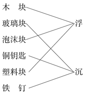 (1)沉到底部 浮 沉 解析:本题考查的是判断物体在水中的沉浮情况,以及对纸在水中的沉浮过程的了解情况。(2)材料 沉 浮 解析:本题考查物体的沉浮与什么因素有关,及常见物体的沉浮情况。
