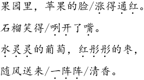 解析 这道题训练同学们词语搭配的能力。左边是形容果实颜色和形态的词,右边给了三种果实。同学们可以根据这三种果实的颜色和形态来连线,连完后再读一读,并把它们积累下来。