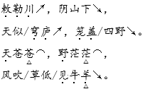 解析 《敕勒歌》前四句押a韵(“野”字古代读音为yǎ),后三句换韵为anɡ。其中“天苍苍,野茫茫”应重读,要读得高亢、明快,体现出豪迈和赞美之情。《望庐山瀑布》这首诗押an韵,朗读时,可用豪迈、激昂、赞美的语调来读,同学们要一边读一边体会诗的意境和诗人的情感,从而体现出一种磅礴雄伟的气势。